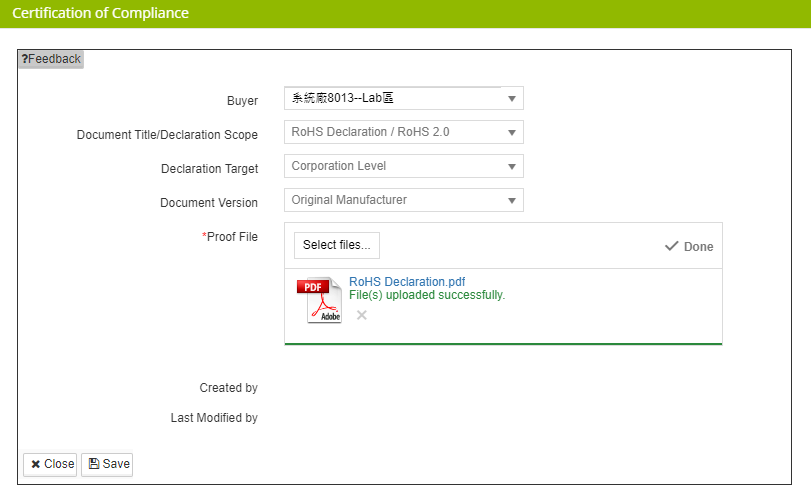 | Document Title/Declaration Scope | The Document Title/Declaration Scope such as RoHS 2.0, REACH, halogen, PFOS .etc. | Required |