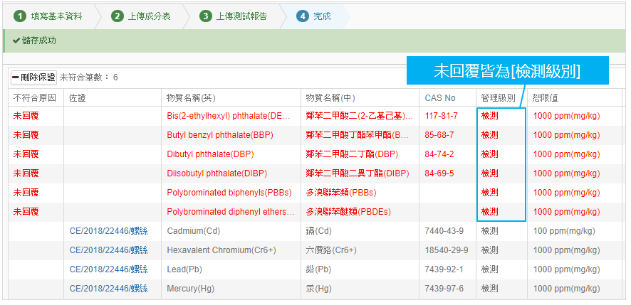 MCD 表格所引用的規範中,如果物質的管理級別設定為"檢測",在回覆MCD 表格所引用的測試報告中,就必須有這幾項物質的檢測資料。