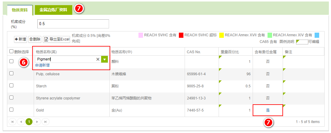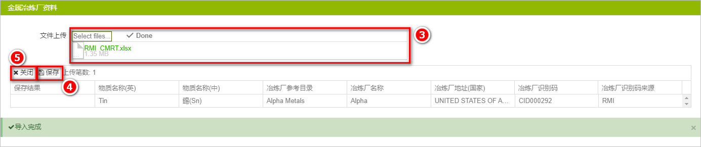 | 上传文件,填写成分表的基本资料 | 包含以下内容 物质资料-含有物质、机密成分含量的重量百分比 金属冶炼厂资料-冲突金属(钴、金、钽、钨、锡)的冶炼厂资料 |