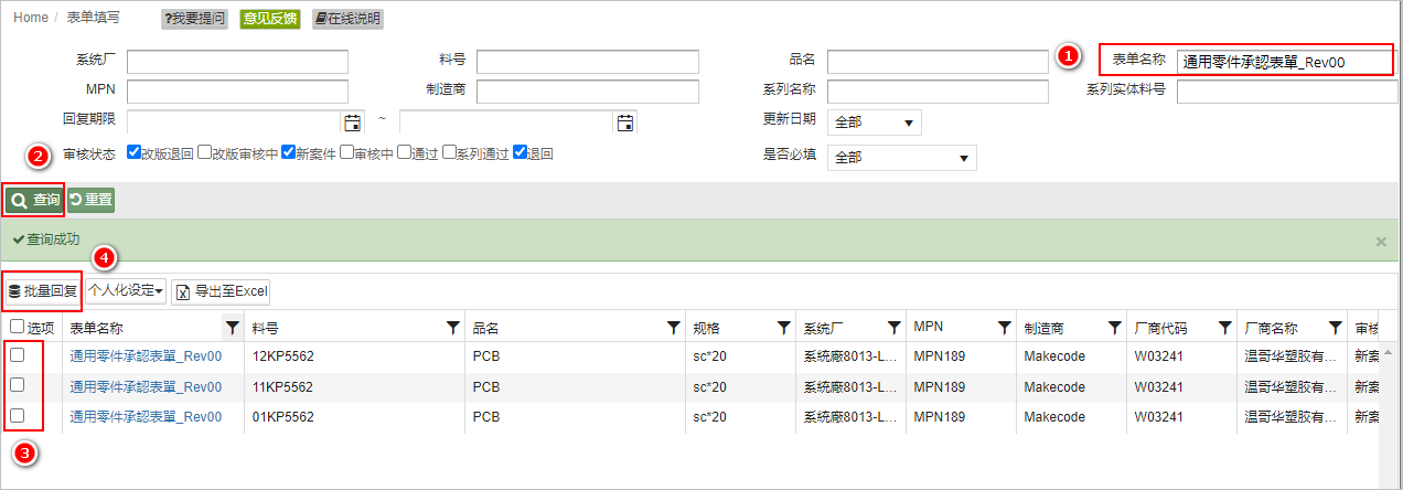 - 在查询结果清单中勾选要回复的表单,点击[批量回复]。