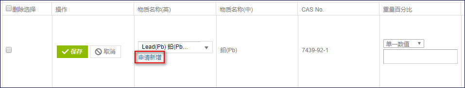 新增/编辑物质时,物质名称栏下方会有[申请新增]键,点击提出申请。