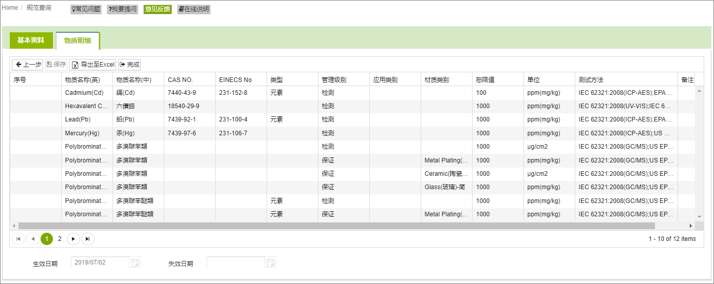 | 规范群组 | 规范的分组类别,例如REACH SVHC各版本规范归类在[REACH SVHC]群组 | |