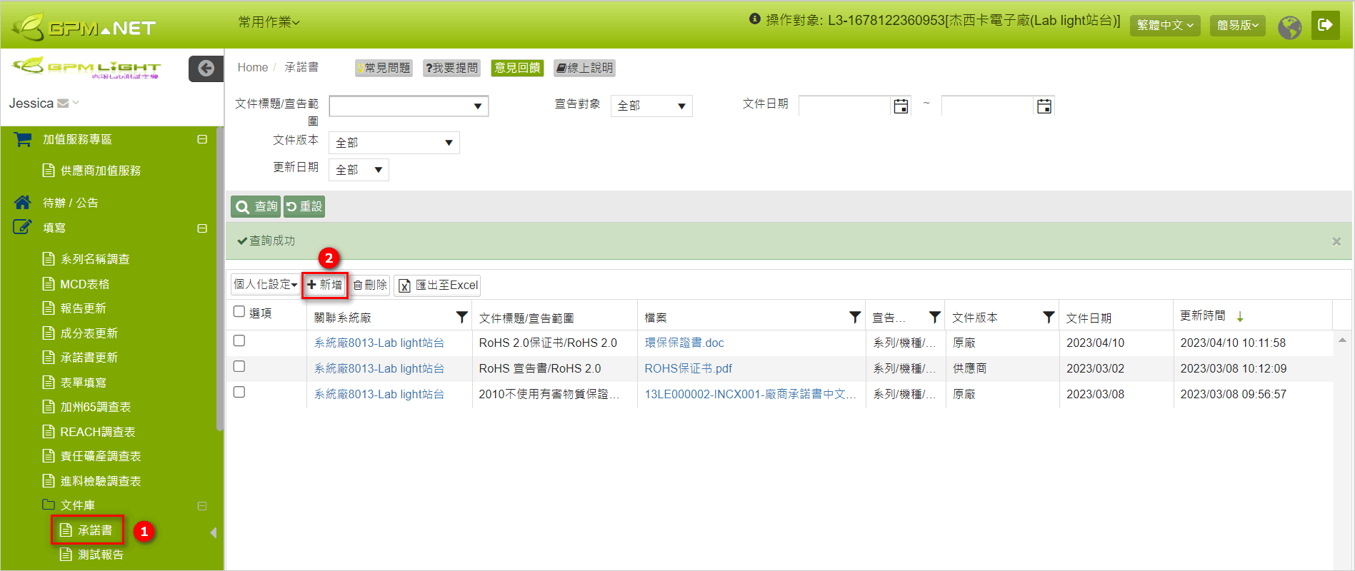 在 ezGPM.NET 平台所有的聲明書、宣告書、材料證明書…等,都可以存放於[文件庫] > [承諾書],此類資料統稱為《承諾書》。承諾書相關的操作說明如下。