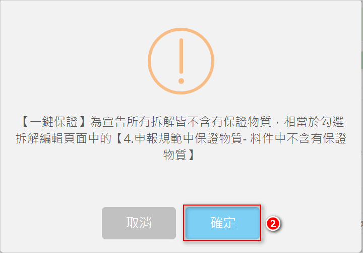 為所有拆解宣告不含有保證物質,相當於勾選編輯拆解介面【4.申報規範中保證物質- 料件中不含有保證物質】。