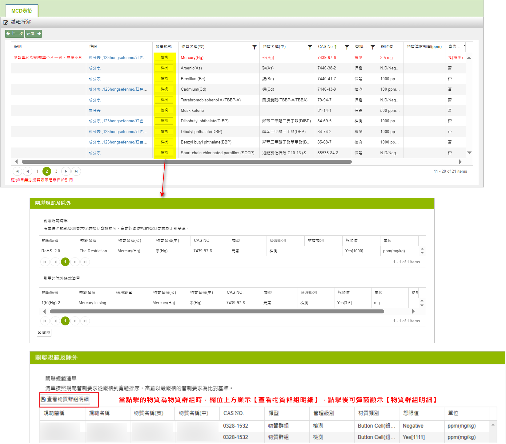 - 當點選的物質為物質群組時,欄位上方顯示[查看物質群組明細]按鈕,點選後可彈窗顯示[物質群組明細]。