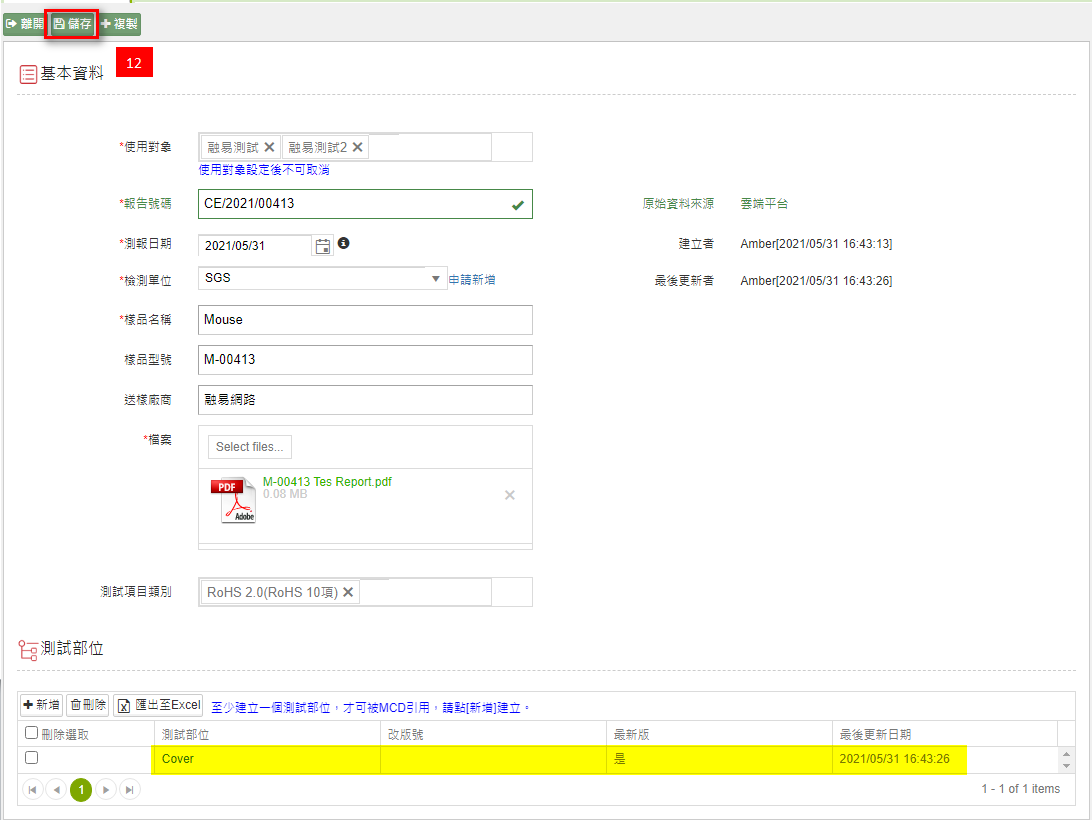 - 基本資料頁面的[測報日期]、[檢測單位]、[樣品名稱]、[樣品型號]、[送樣廠商]、[文件]欄位會變為可編輯狀態,編輯後點擊後點擊左上角的[儲存]鍵。