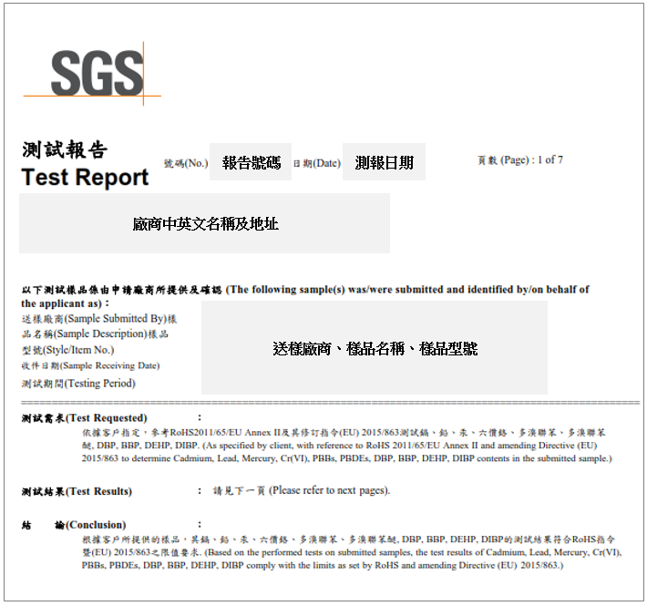 測試報告第一頁通常會有:報告號碼、測報日期、檢測單位、送樣廠商、樣品名稱及樣品型號。