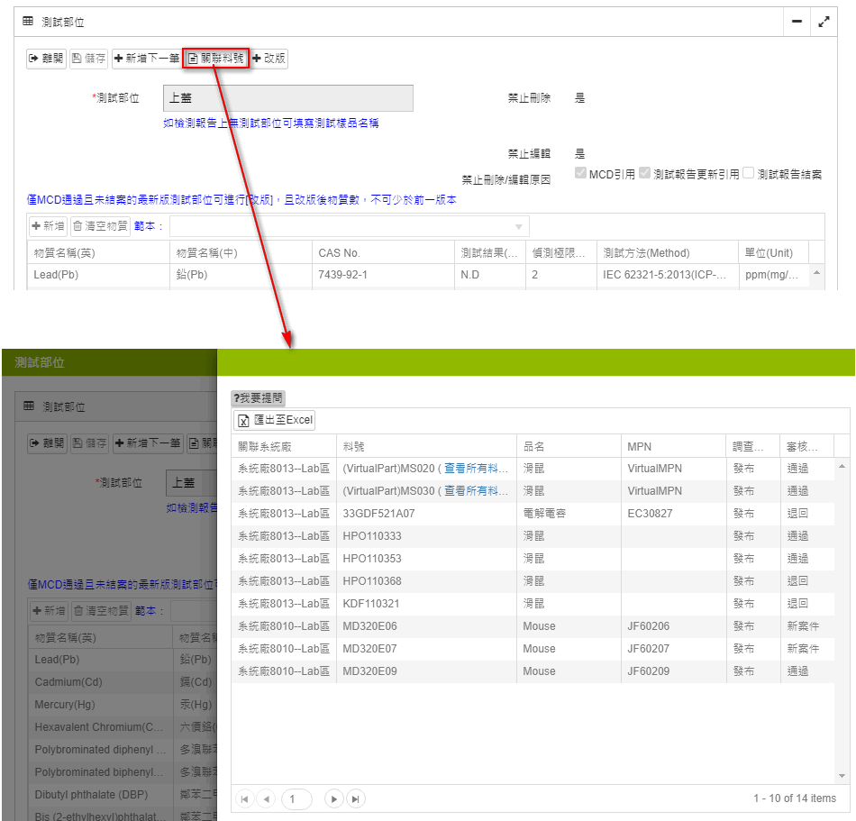 | 上傳報告檔案,填寫測報的基本資料 | 送測零件的拆解測試部位 | 各個測試部位的物質檢測結果 |