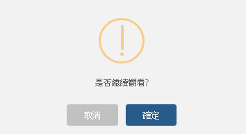 查核影片觀看狀況:簽到後系統會隨機查核觀看與否,查核時會暫停播放並跳出下方查核對話框,按[確定]繼續播放,點選[取消]畫面會自動跳轉回清單畫面;若並未在觀看,只要未逾時登出,畫面會停留於此狀態,欲再觀看影片時,點選[確定]影片則會繼續播放。