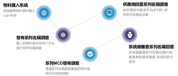 - 若整個系列的關聯物料都被執行系列名稱退回,此系列產生的虛擬MCD會自動停止調查。如果後續有其它物料需要再宣告為此系列名稱,此筆虛擬MCD即會自動發佈調查。