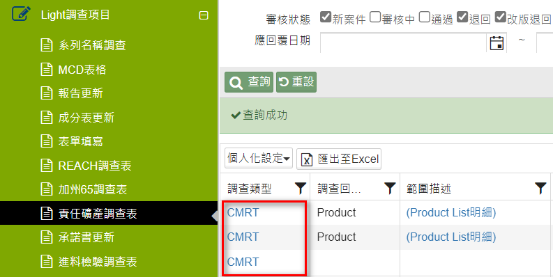- 點選左側功能列[Light調查項目],進入該調查項目的查詢頁面(下圖為點選[MCD表格]的畫面)。