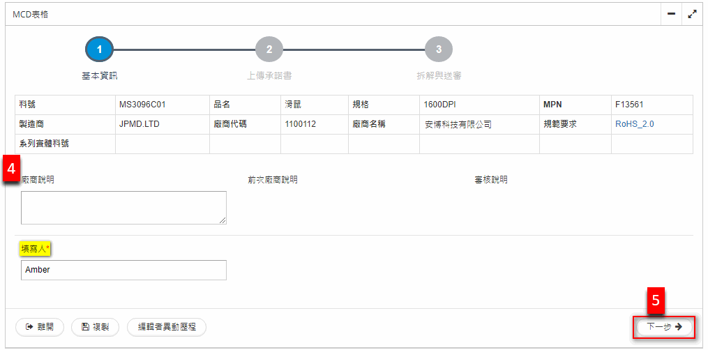 若客戶有開放供應商可自行重啟調查MCD表格(僅限通過之MCD表格),即可修改MCD表格後再次送審,操作步驟如下: