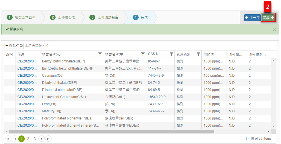 於[完成]頁點選[佐證]欄位的藍字報告號碼,可連結到該報告的測試部位資料編輯頁(此步驟的操作的方式皆相同,下方將不再展示步驟圖)。